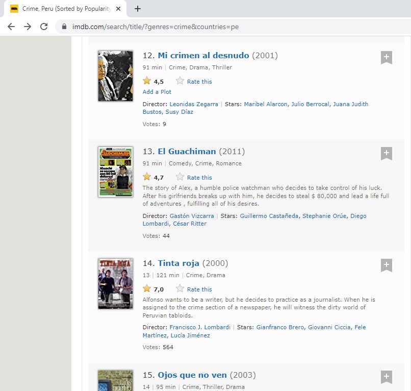 Cime, Peru (Sorted by Popularity Ascending) 56 títulos [Includes shorts, documentaries, tv series, etc.] Crime
